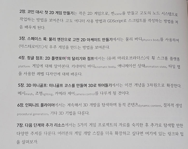 이어서 챕터2부터 각 챕터별로 간단한 게임을 직접 만들어보며 고도엔진에 대해 배울 수 있게 구성이 되어 있습니다.