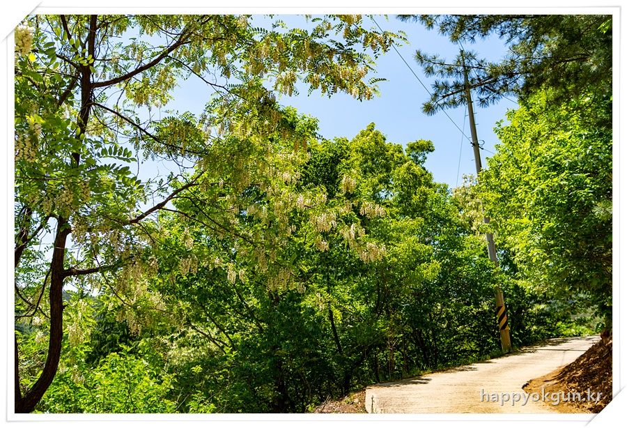 아카시아 나무가 있다. 꽃이 피는 계절인가보다. 아카시아 꽃이 이쁘게 피어있다.