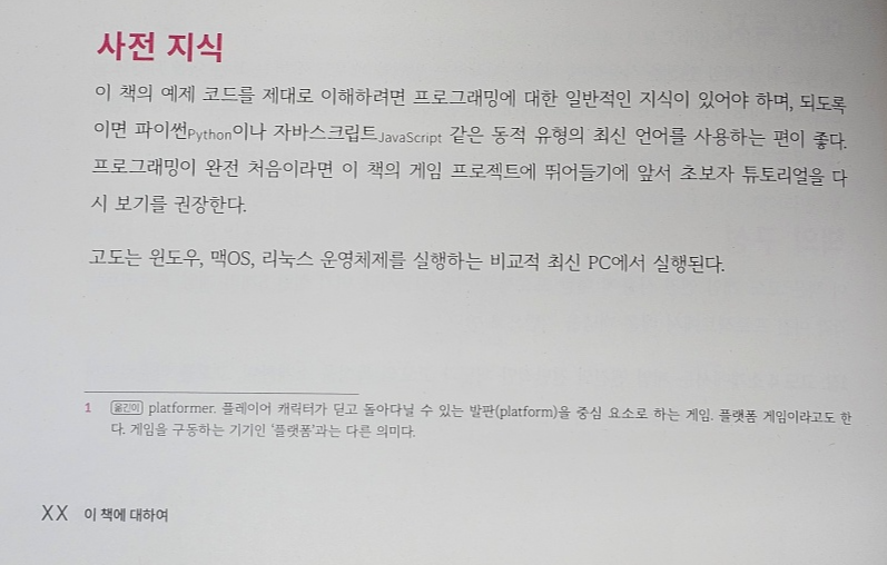 설명이 대체적으로 자세히 설명되어 있긴 하지만, 이 책에서는 프로그래밍언어나, 게임프로그래밍의 기초에 대해 설명하지 않습니다. 그래서 자신이 프로그래밍 언어를 배우지 않은 상태라면 우선 파이썬 언어를 어느정도 기초를 습득한 상태에서 보면 더 도움이 될것 같습니다.